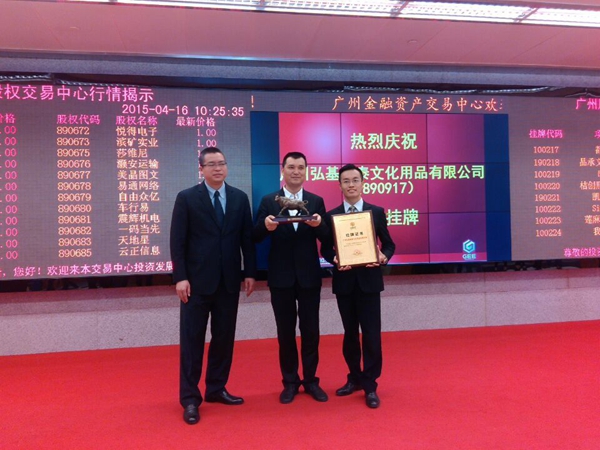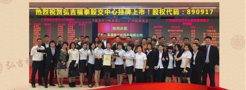 4月16日周四上午9:00~12:00,广州弘基福泰文化用品有限公司将在广州股权交易中心正式举行挂牌上市仪式,届时公司相关领导将带领公司核心团队和部分投资公司的企业家在广州股权交易中心开启资本大门并敲响挂牌宝钟!..